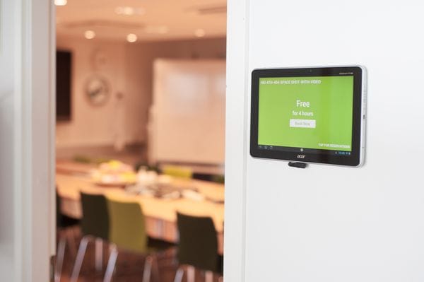 Reservator uses your Google calendar’s resources for the conference rooms. The application displays the bookings of the room it is located at, but you can also use it to book other rooms. It will also display whether the room is available or not, as seen in the picture above. While using Reservator, you can still book rooms normally through Google Calendar. For the setup of this application you only need to sync your tablet with a Google account that has resources available and select the correct room in the application.